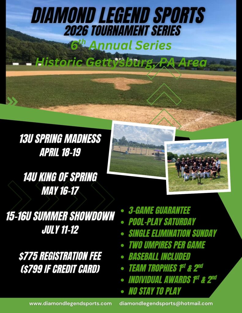 The Diamond Legend Sports tournament series is returning once again in 2026. All tournaments are 3GG, balls are provided, and the umpires are paid for. Cost per team is $775 if paying by check ($799 if paying by credit or debit to cover transaction fees). All tournament sites will be within 15 minutes of Gettysburg. A team trophy will be given to the 1st and 2nd place teams and individual awards will be given to players in tournaments 14u and younger. There is an 8 team max per tournament. Your spot is not secured until payment is received. The first 8 teams to pay will be locked into the tournament field. Schedules will be released the Tuesday prior to the tournament date. Please register in the form below and select the appropriate tournament. If paying by check, please make check out to “Diamond Legend Sports” and send to 1429 Chambersburg Rd, Gettysburg, PA 17325. If electing to pay by card, we will send you a Square invoice. You will also receive an email notification that we received your registration within 24 hours of submission.